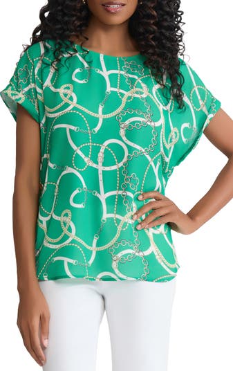 Cuffed dolman sleeves enhance the drapey fit of a chic chain-print top accented with high-shine side buttons.