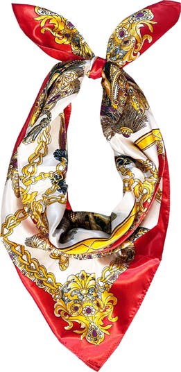 Ornate chain motifs and jewel-toned accents bring bold baroque energy to this square scarf designed for versatile styling at the neck, in the hair or tied to your favorite bag.