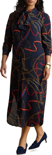 A tie at the waist shapes the wrap-style skirt of this fluid crêpe de Chine shirtdress covered in a mesmerizing chain print for a signature flourish.