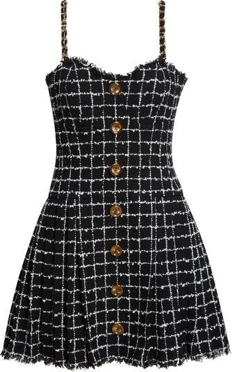 Sculptural buttons match the gleam of the fabric-threaded chain straps on this fit-and-flare minidress made from color- and texture-checked tweed.