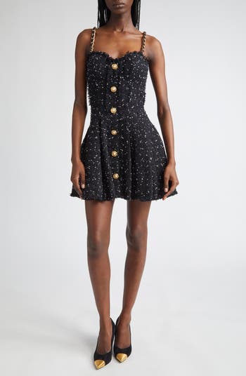 Sculptural buttons with faux-pearl centers polish this fit-and-flare minidress crafted of polka-dot tweed and topped with fabric-laced chain straps.