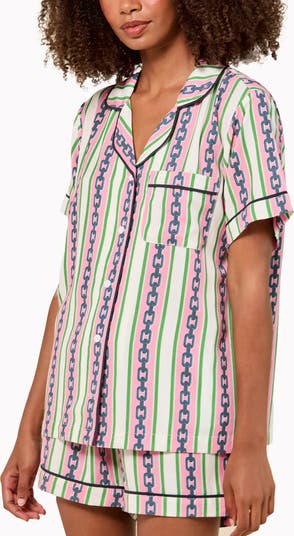 Our new Chain Stripe pajamas for fall bring a clean, modern edge to your sleepwear drawer. Blue-green links line up on crisp white for a look that’s both bold and effortlessly chic. Our Women’s Pajama Shorts Set — is cut in a timeless silhouette with classic piping detail. The shorts’ elastic waist and adjustable ribbon tie ensure a custom, universally flattering fit.