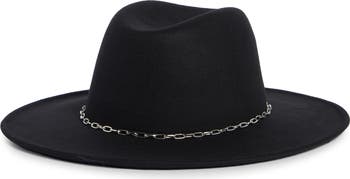 This felt fedora plays with texture featuring a gleaming chain wrapped around the crown.