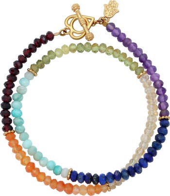 Infused with the spectrum of emotional and spiritual harmony, the Chakra Bloom Bracelet wraps your wrist in color, energy, and intention. Hand-strung with 4 mm faceted rondelle beads in Garnet, Citrine, Carnelian, Amethyst, Peridot, Amazonite, and Lapis, each gemstone aligns with the chakras to support balance, vitality, and clarity. A heart-shaped charm in glowing 18K gold-plated brass centers the design symbolizing love as the unifying force behind all things. Designed to wrap twice, and secured with a classic toggle clasp, this piece offers both beauty and purpose for mindful adornment.