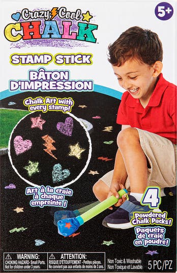 ALEX: COOL CHALK - STAMP STICK - Elevate sidewalk art to a whole new level with this innovative stamp stick that effortlessly creates colorful designs with every strike. With just a flick of your wrist, you can unleash three different designs: stars, hearts, or lightning bolts, adding an exciting twist to your chalk creations. Our Stamp Stick comes with four vibrant color packs of easy-open, easy-load powdered chalk in green, blue, orange, and purple. Let your imagination run wild as you blend colors and create eye-catching masterpieces that will dazzle and delight. Use this Stamp Stick to enhance both your children's physical activity with exercise, overall health, and their creativity with chalk creations. Unleash artistic brilliance while you play! Includes Green, blue, orange and purple! Recommended for children 5 years of age and older. Includes: 1 Stamp Stick, 4 Chalk Packets.
