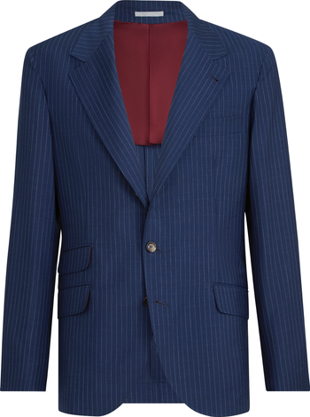 The distinctive texture of the fresco showcases a slightly uneven color, revealing the subtle lines of the weave and accentuating the elegant allure of the chalk stripe pattern. The natural wool and mohair fibers are blended into a fine, airy fabric that envelops the silhouette with balanced volume. Inside, a cupro lining provides added comfort.