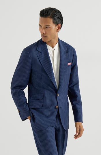 The distinctive texture of the fresco showcases a slightly uneven color, revealing the subtle lines of the weave and accentuating the elegant allure of the chalk stripe pattern. The natural wool and mohair fibers are blended into a fine, airy fabric that envelops the silhouette with balanced volume. Inside, a cupro lining provides added comfort.