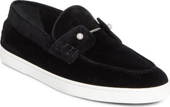 The French label brings bold hardware shine to the minimalist silhouette of this black-velvet loafer detailed with a sparkling crystal-pavé ball-stud bit. A logo-scrawled Louboutin-red inset at the sole adds a burst of signature color to every step.