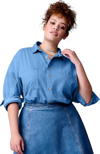 We updated a classic denim shirt in a lightweight chambray fabric. A softer texture and relaxed fit on this button-down blouse lends itself to keeping you comfortable all day, whether you're staying in or running out. Patch pockets. Shirtail hem. Side slits.