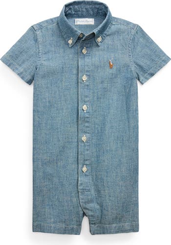 Baby will look sharp on the day's adventures in this button-down polo-romper made from cotton chambray that will get softer with each wash.