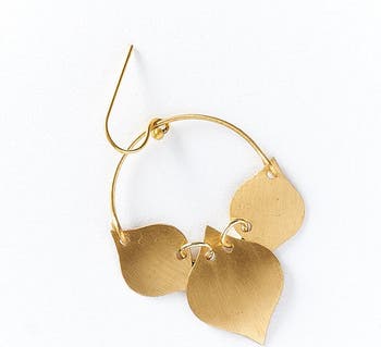 Our flattering Chameli Collection features versatile, modern floral motifs in a bouquet of gold and teal patina finish designs on brass. Traditional jewelry making techniques of Old Delhi are thoughtfully applied in this simple, elegant design for a uniquely rich quality. These handcrafted hoop earrings feature lightweight, brass leaf charms in a refined, linked design with gold tone finish.