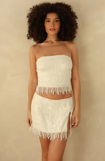 Our new beaded floral mini skirt designed with a flattering slit on one side. Pair with our new Love On The Rocks Top to complete the set.
