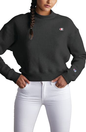 Champion's iconic logo brands a contemporary cropped sweatshirt cut from a comfy cotton blend and finished with a distinctive mock neck.