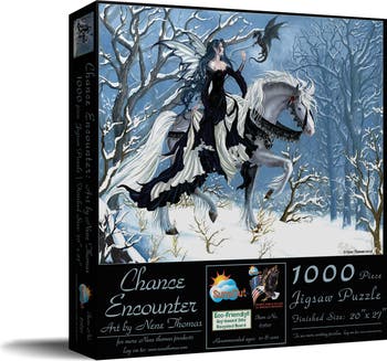 Immerse yourself in an enchanting artistic journey with the Chance Encounter 1000 Piece Jigsaw Puzzle by SunsOut, intricately designed by renowned artist Nene Thomas. This captivating puzzle draws you into a mystical realm of fantasy, featuring a mysterious fairy on horseback adventuring through a winter wonderland. Once pieced together, the 20" x 27" masterpiece is a stunning testament to your devotion and creativity, blending challenge and satisfaction in a vividly colored scene of fantasy, nature, and animals. Enjoy a seamless assembly experience with SunsOut's premium interlocking design, meticulously crafted from high-quality recycled cardboard that aligns perfectly from start to finish and remains durable for years. Committed to eco-conscious craftsmanship, SunsOut uses soy-based inks and high-quality recycled board, preserving our planet whilst offering top-tier entertainment. Proudly crafted in the USA by a woman-owned small business, SunsOut emphasizes quality and customer satisfaction, reflecting this dedication via their worry-free guarantee for any missing or damaged pieces. Posing as a delightful evening unwind or captivating group activity, the Chance Encounter puzzle brings the majestic mystery of fantasy into your living space. Perfect for adults, spark your imagination and allow each completed piece to lead you closer to the artist's inspiring vision. Choose SunsOut for its sustainability, US craftsmanship, and a thrilling plunge into a world where imagination knows no bounds. Your artistic escape awaits.