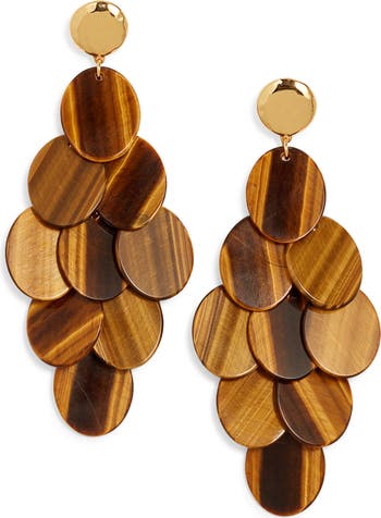 Coins of stone bring layered dimension to these handcrafted chandelier drop earrings topped with hammered 24-karat gold-plated discs.