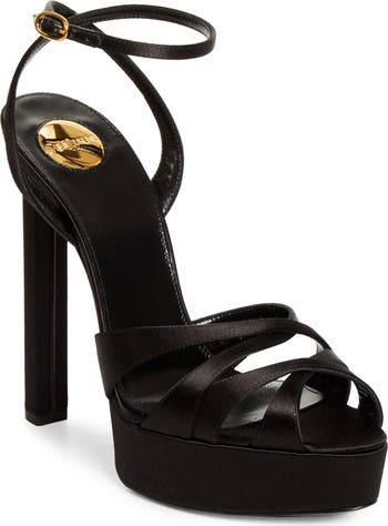 Slim, satiny straps cross over at the toe of this sleek ankle-strap sandal lifted sky high on a lofty platform and heel.