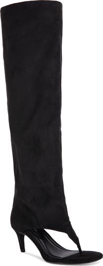 A smooth faux-suede shaft brings plenty of modern luxury to this distinctive stiletto sandal.