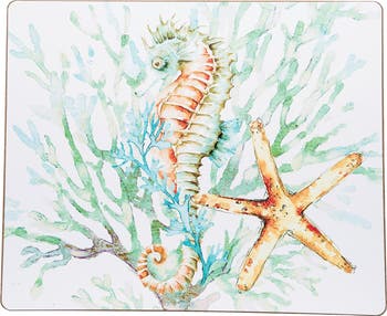 Let Chandler Cove transform your tablescape into a tropical adventure! A large scale coastal print brings the beach to you, no matter where you are, with vibrant color and iconic seahorse, starfish, coral, and sea turtle motifs. Our hardboard placemats are constructed to provide an enduring surface to protect your table from heat, scratches and staining. Designed for your everyday living these hardboard placemats are heat resistant up to 212°F, constructed with a cork backing, hardwood middle and decorative printed design. These hardboard placemats are not suitable to be used as a cutting surface, and should be protected from sharp objects. Care is simple and easy, wipe clean with a damp sponge or cloth. Do not submerge in water.
