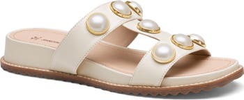 Pearly beads add a dose of elegance to the glove leather upper of a foam-cushioned slide sandal grounded by a subtle wedge heel and sawtooth rubber sole.