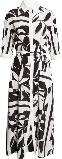 An abstract floral pattern in stark black and white blurs the line between art and fashion in this belted midi dress cut from fresh, breathable silk.