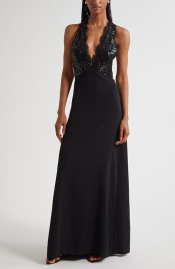 Sequins and lace start the elegant style story for a plunge-necked gown that's set to stun.