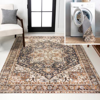 Our Persian chenille rug boasts a bold color palette and medallion design. This durable, machine-washable rug is a perfect addition for any busy family. This timeless rug enhances any mid-century or traditional home.