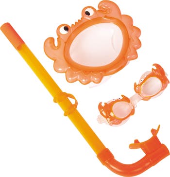 BESTWAY: POOL SWIM SET - Crab character swim set, orange - Make a splash with underwater adventure using the Bestway Hydro-Splash Pool Swim Set – Orange Crab Edition! This adorable character-themed swim set gives kids everything they need to explore beneath the surface and have fun while building confidence in the water. Designed with a fun, silly orange crab motif, the set includes a pair of leak-resistant goggles and a matching snorkel, making it perfect for pool play and beginner snorkeling. The goggles feature durable polycarbonate lenses and a double feathered edge skirt to ensure a precision fit and reliable seal, while the adjustable head strap lets kids find their perfect size. The snorkel has a soft, comfort-fit mouthpiece and an adjustable strap retainer that keeps it securely in place. Great for children ages 3 and up, this set helps make learning to swim and explore feel like an exciting underwater game. With the Bestway Hydro-Splash Swim Set, kids will dive into hours of aquatic fun, imagination, and safe adventure. OVERVIEW: Polycarbonate lens. Double feathered edge skirt for precision leak-resistant fit. Soft, comfort-fit snorkel mouthpiece. Adjustable snorkel strap Retainer. Orange crab-themed snorkel set.