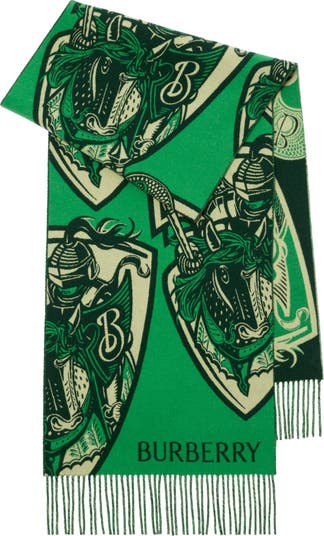 A scarf made in Italy from wool cashmere, jacquard-woven with artwork depicting elements from our Equestrian Knight Design. Created in our London studio, the Knight and horse are framed by a shield .||Rectangular|Fringing at both ends|Woven Burberry lettering at hem
