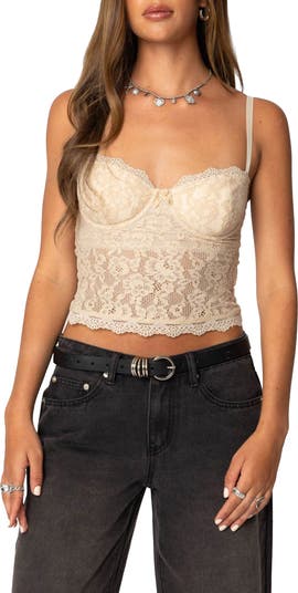 This full-of-charm cami is made from lovely lace that's sheer below the bra-inspired bust and detailed with a cute cutout at the back for an extra peekaboo of skin.