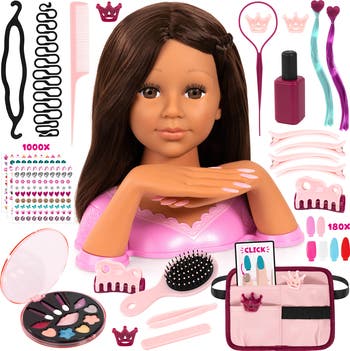 - FUN STYLING ACCESSORIES: A wide variety of styling accessories make it easy to design chic everyday hairstyles or dazzling party-ready looks. Children can mix and match pieces to create endless fashionable styles.STURDY BASE DESIGN: With her stable, well-balanced base, Charlene stands firmly on any table. Kids can focus on styling hair, decorating nails, and applying make-up without frustration or tipping.