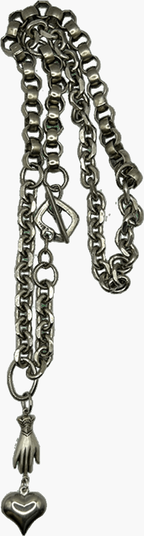 22 inch antique hand charm holding a heart on silver mixed chain with toggle closure. Perfect for any occasion.