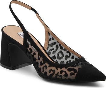 Leopard spots add untamed allure to this mesh slingback pump set on a canted block heel.