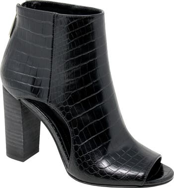 An open toe and curvy cutouts at each side make this stacked-heel bootie perfect for transitioning between seasons.