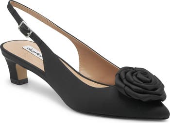 A voluminous floral appliqué adorns the pointy toe on an elegant satin pump set on a chunky kitten heel and secured with an adjustable slingback strap. A cushioned footbed and slip-resistant sole offer comfort and stability.