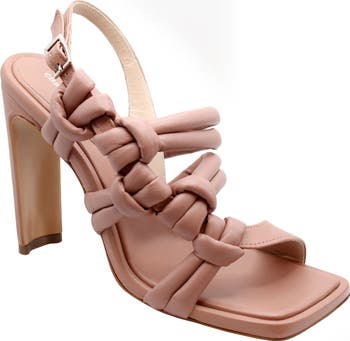 Knotted accents cascade down the side of a daring leather sandal framed by a squared toe and shaved block heel.
