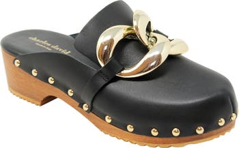 Voluminous chain-link hardware and gleaming studs embolden a leather clog lifted by a woodgrain block heel.