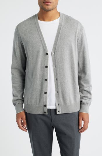 The superfine-gauge knit of this classic cotton and cashmere cardigan provides maximum versatility and layerability, while subtle contrast tips the edges.