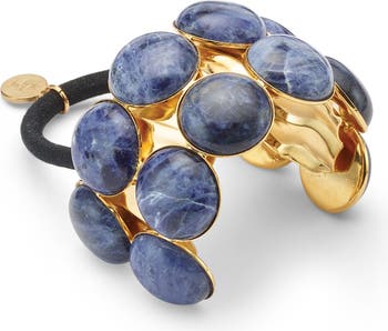 Add bright color and rich texture to your updo with this charming ponytail holder shaped in a golden curve and adorned with smooth sodalite stones.