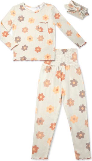 Send her to sleep in style with this charming 3-piece pajama set that includes a long-sleeved tee and pant with whimsical lettuce edging--plus a matching headwrap with adjustable fit for pre-bedtime cuteness!