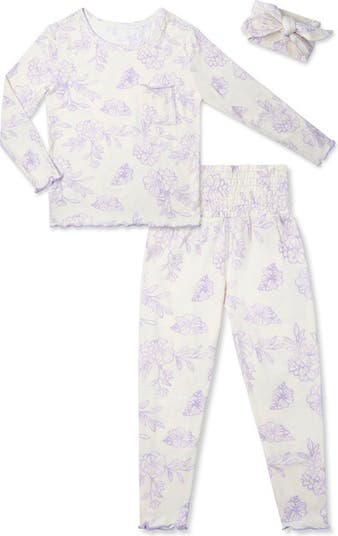 Send her to sleep in style with this charming 3-piece pajama set that includes a long-sleeved tee and pant with whimsical lettuce edging--plus a matching headwrap with adjustable fit for pre-bedtime cuteness!