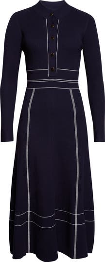 Sleek with a playful twist, this midi dress is rib-knit for a contoured fit that gently flares into a fluid skirt. Contrast stitching traces the silhouette for added definition, while a high neckline and button placket bring a clean, modern finish.