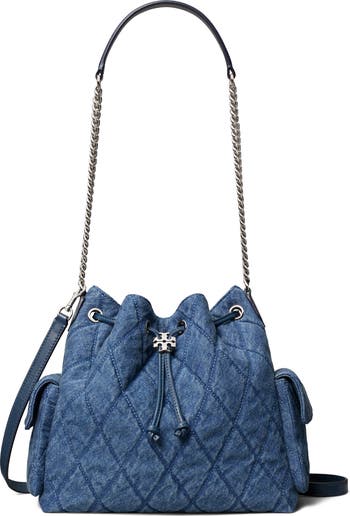Diamond stitching creates quilted dimension on a bucket-inspired denim shoulder bag featuring multiple pockets and straps for on-the-go styling and versatility.