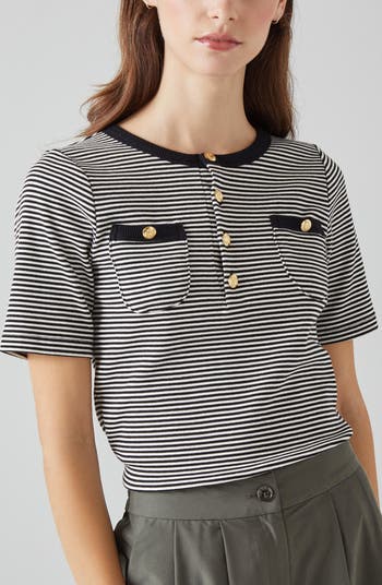 Soft ribbing textures this pocketed striped top designed with golden buttons and abbreviated sleeves.