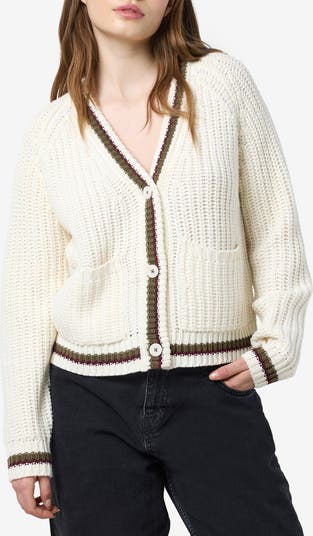 Perfectly preppy for any season, this V-neck cardigan features chunky yarns and tipped edges to give it retro varsity style.