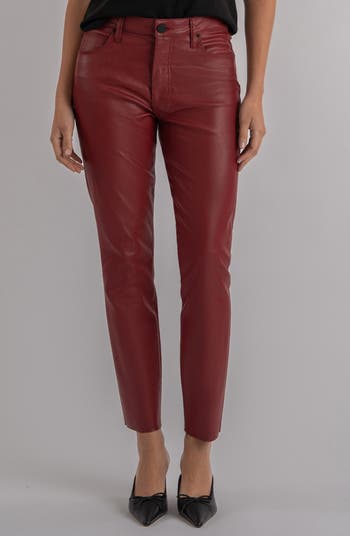 Raw hems and a leather-like coating add edgy style to stretchy cigarette jeans that are slightly wider around the ankles than typical skinnies.