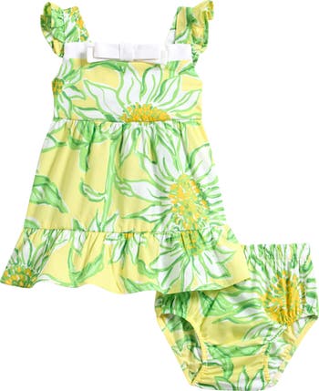 A floral print in zesty hues amplifies the warm-weather appeal of this baby-sized cotton dress that's framed by cute flutter sleeves and paired with matching bloomers.