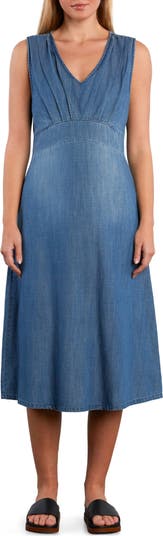 Lightweight cotton-blend denim gives this sleeveless dress an easy, polished feel. A pleated bodice and V-neckline create soft structure, while a curved waistband defines the silhouette before releasing into a flared skirt.