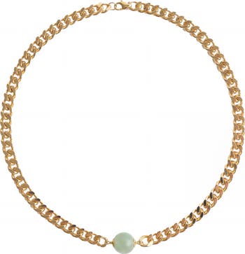 Picture a luscious, round green jade pendant at the heart of a luxuriously thick gold chain, creating a captivating focal point. To add a touch of refined elegance, two pearls delicately grace the ends of the chain, completing this necklace with a perfect harmony of opulence and grace.