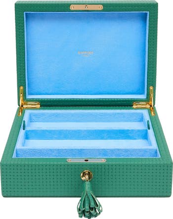 A blend of elegance and craftsmanship, our Charlotte Jewelry Box is wrapped in a woven leather texture that adds sophistication. The vibrant suede interior offers a home for your most cherished pieces. Designed with multiple compartments, it ensures organised storage for rings, earrings and accessories. The gold hardware and leather tassel key complete the box, perfect for the collector with a flair for bold luxury.