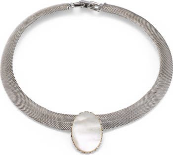 Finely woven mesh forms a refined statement choker where a glowing mother-of-pearl centerpiece punctuates the smooth, contoured silhouette.
